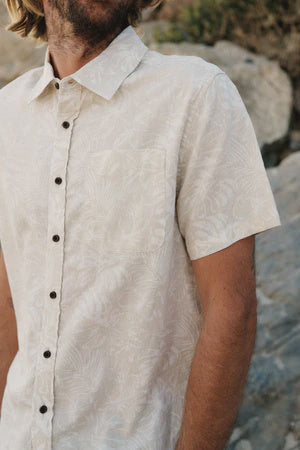 The Moco Shirt features a floral graphic inspired by the islands atop a breathable cotton linen blend.